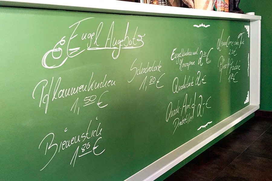 Ein Blick auf die Speisekarte lässt erkennen, wieviel Herzblut Ronny und Felix Engel in ihr Café gesteckt haben. Hier verkünden sie stolz: »Café Engel ist weiterhin ein Treffpunkt für gute Gespräche, einen Schwatz, Klatsch und Tratsch, kleine Familienfeiern, mal eine Buchlesung, mal Musik von Omas Schallplatte«.